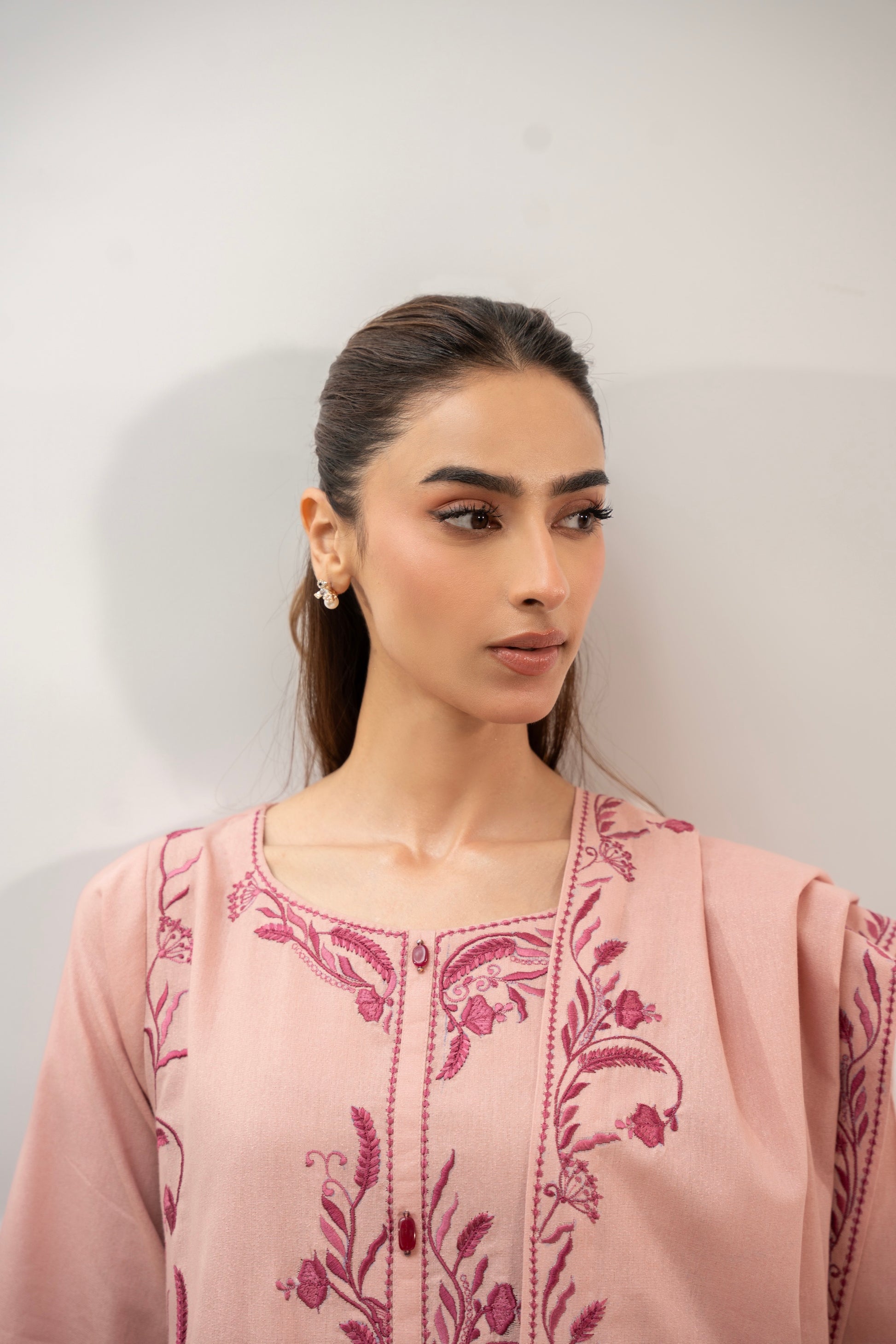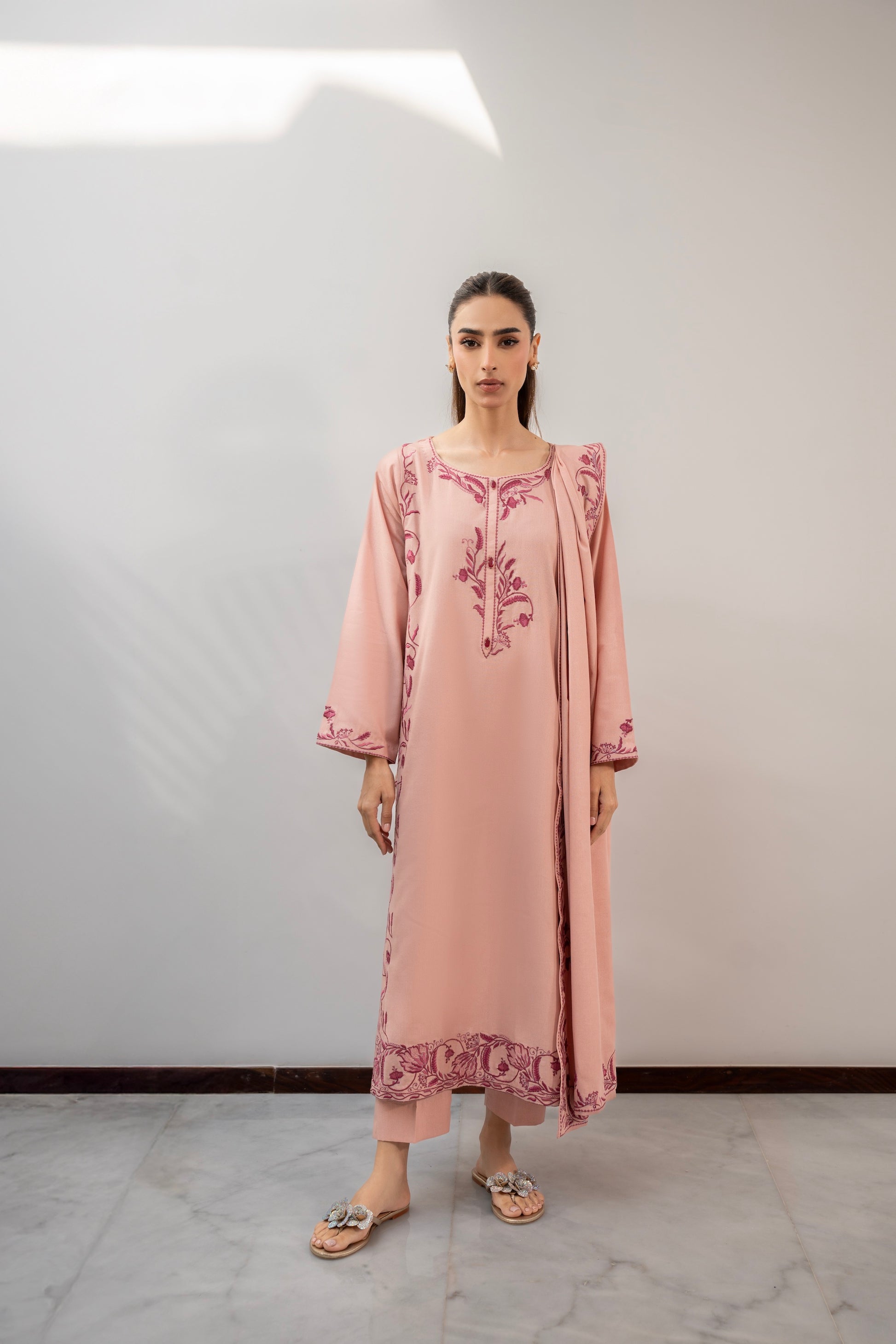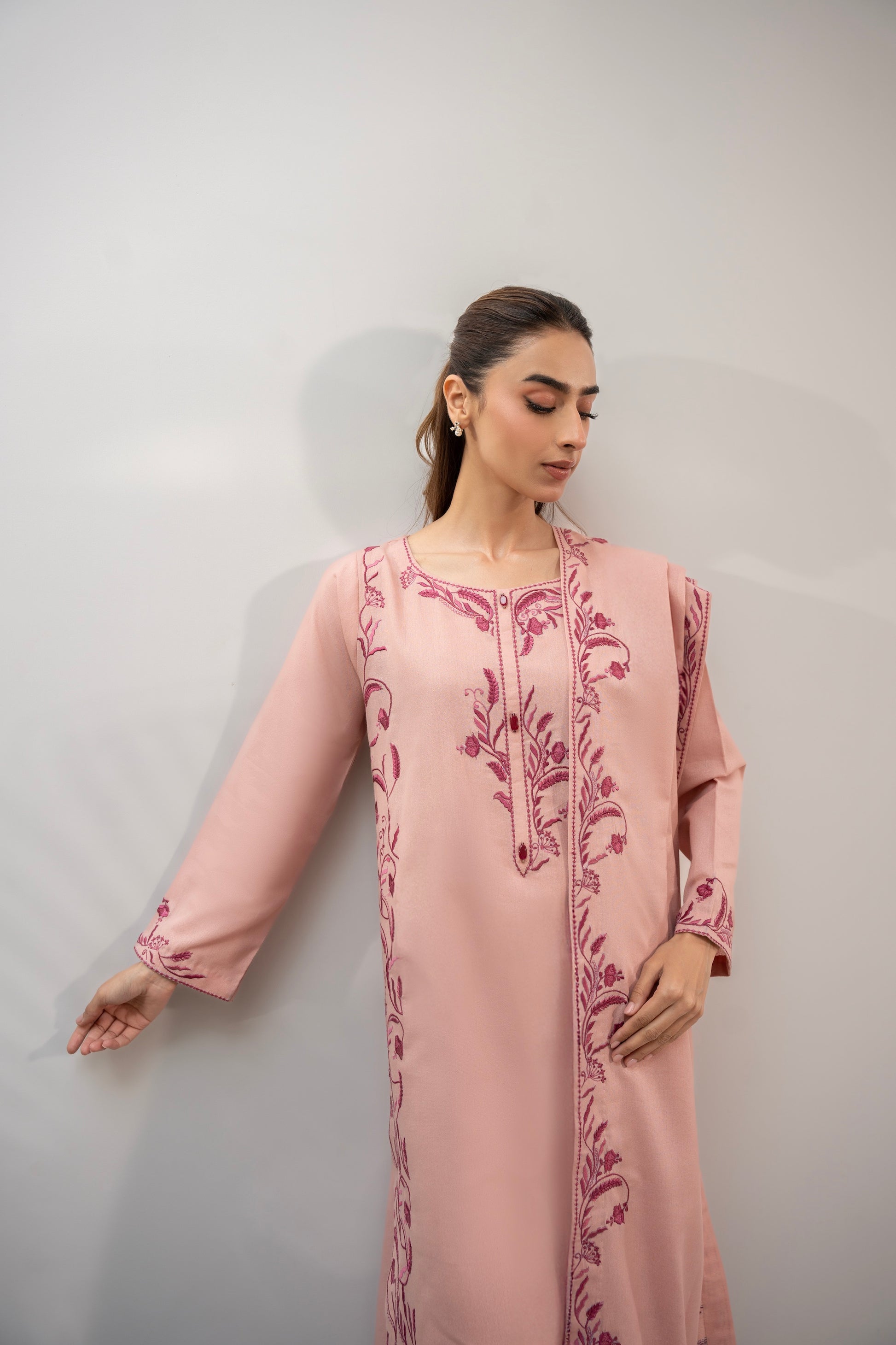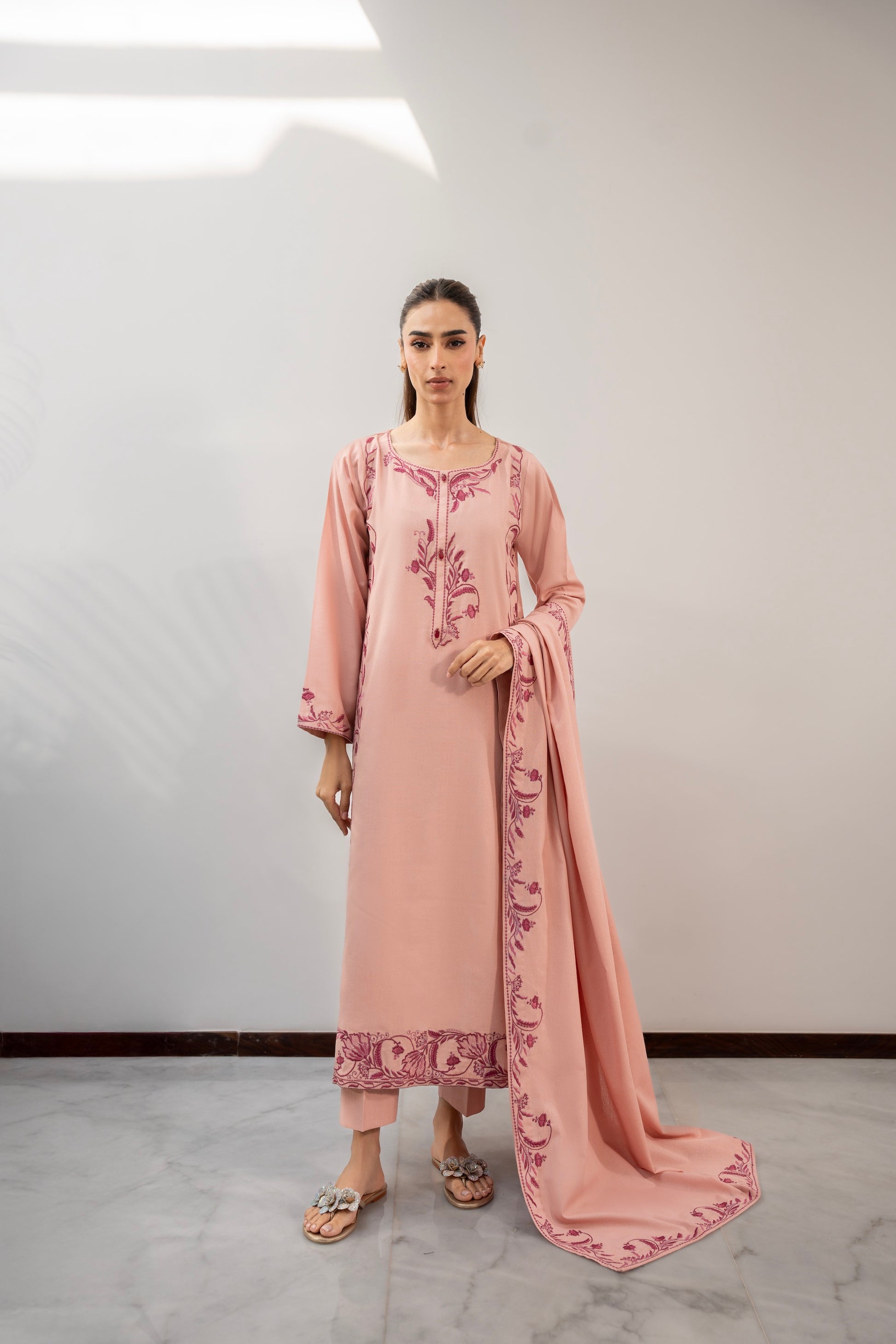 Pastel pink for your evening soirees, this three piece outfit features gorgeous embroidery on the front of the shirt. Paired with a four sided worked shawl - this outfit is a must have.