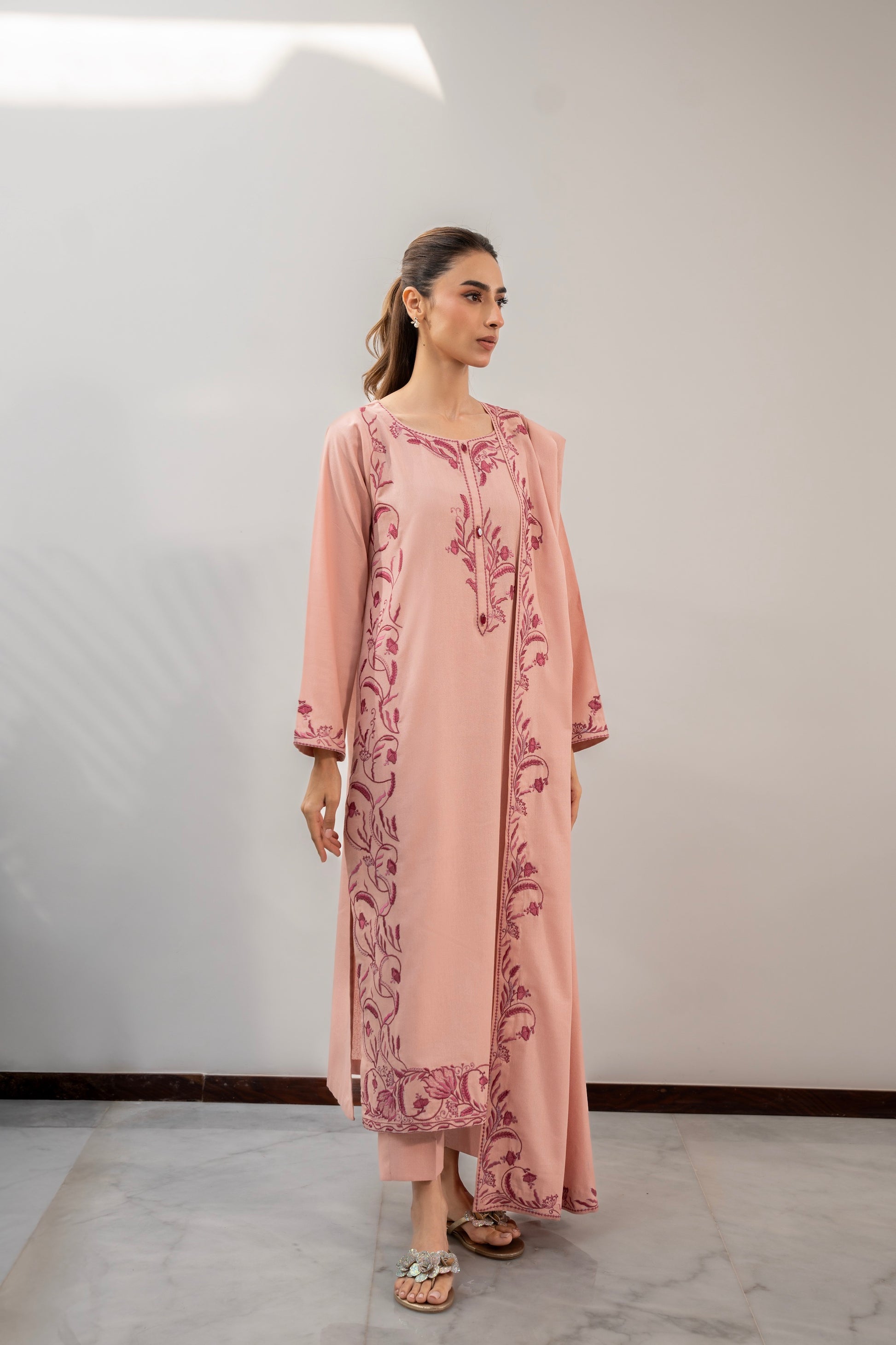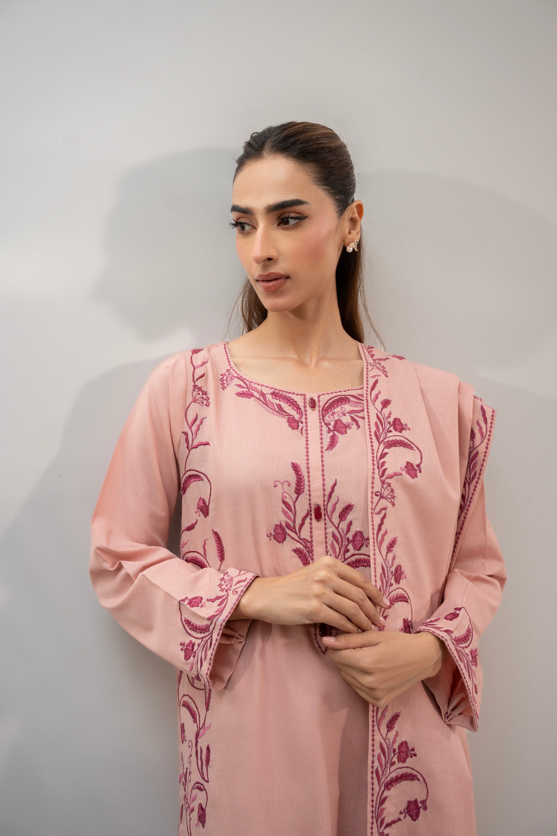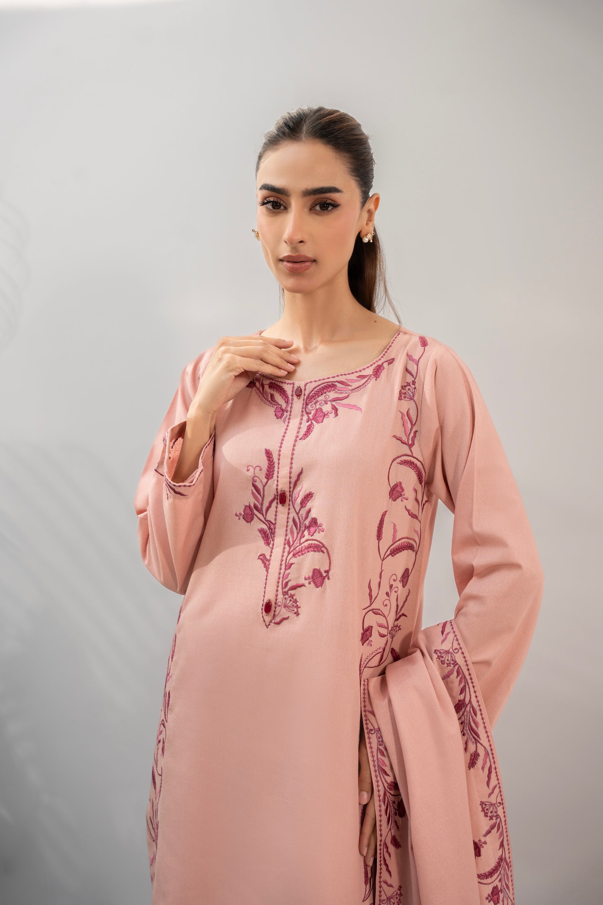 Pastel pink for your evening soirees, this three piece outfit features gorgeous embroidery on the front of the shirt. Paired with a four sided worked shawl - this outfit is a must have.
