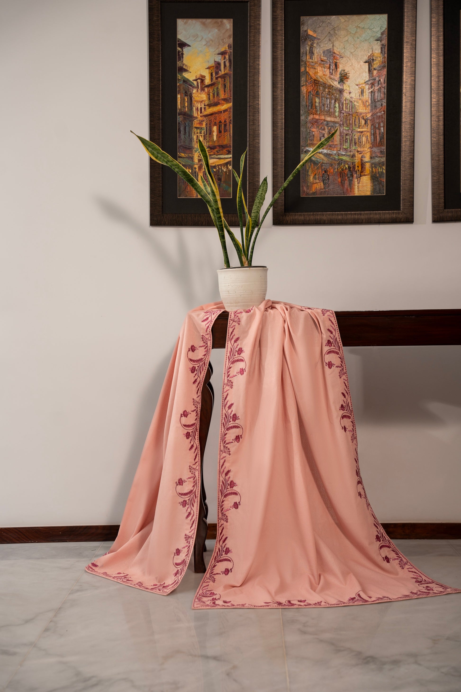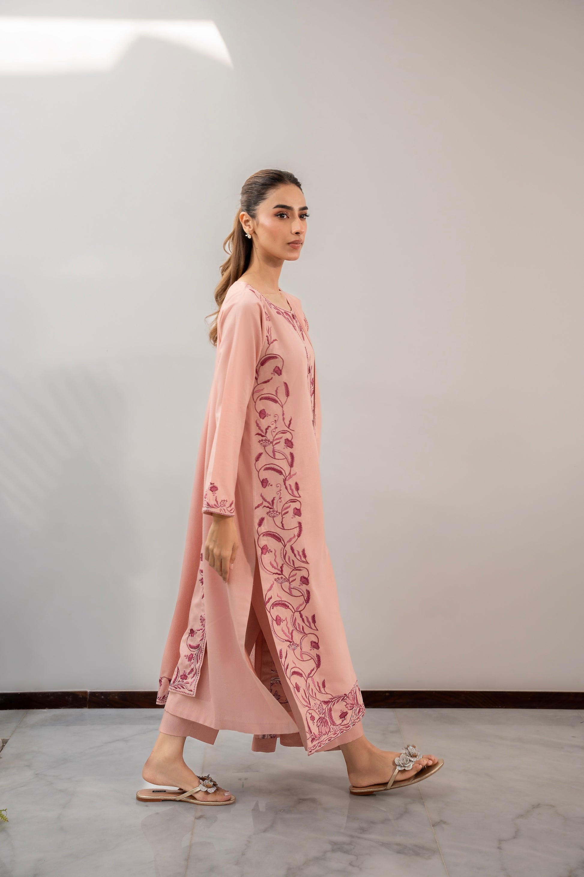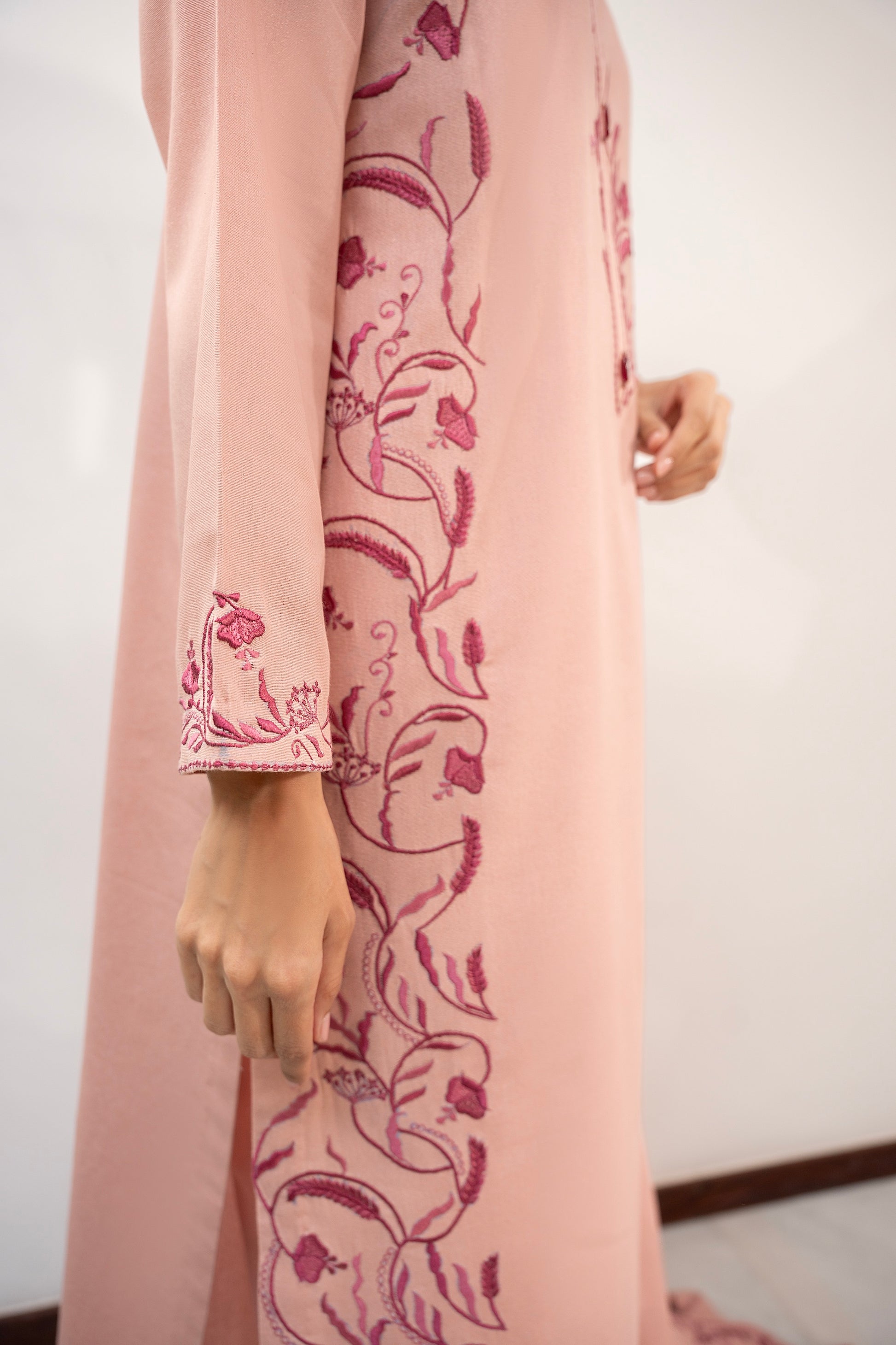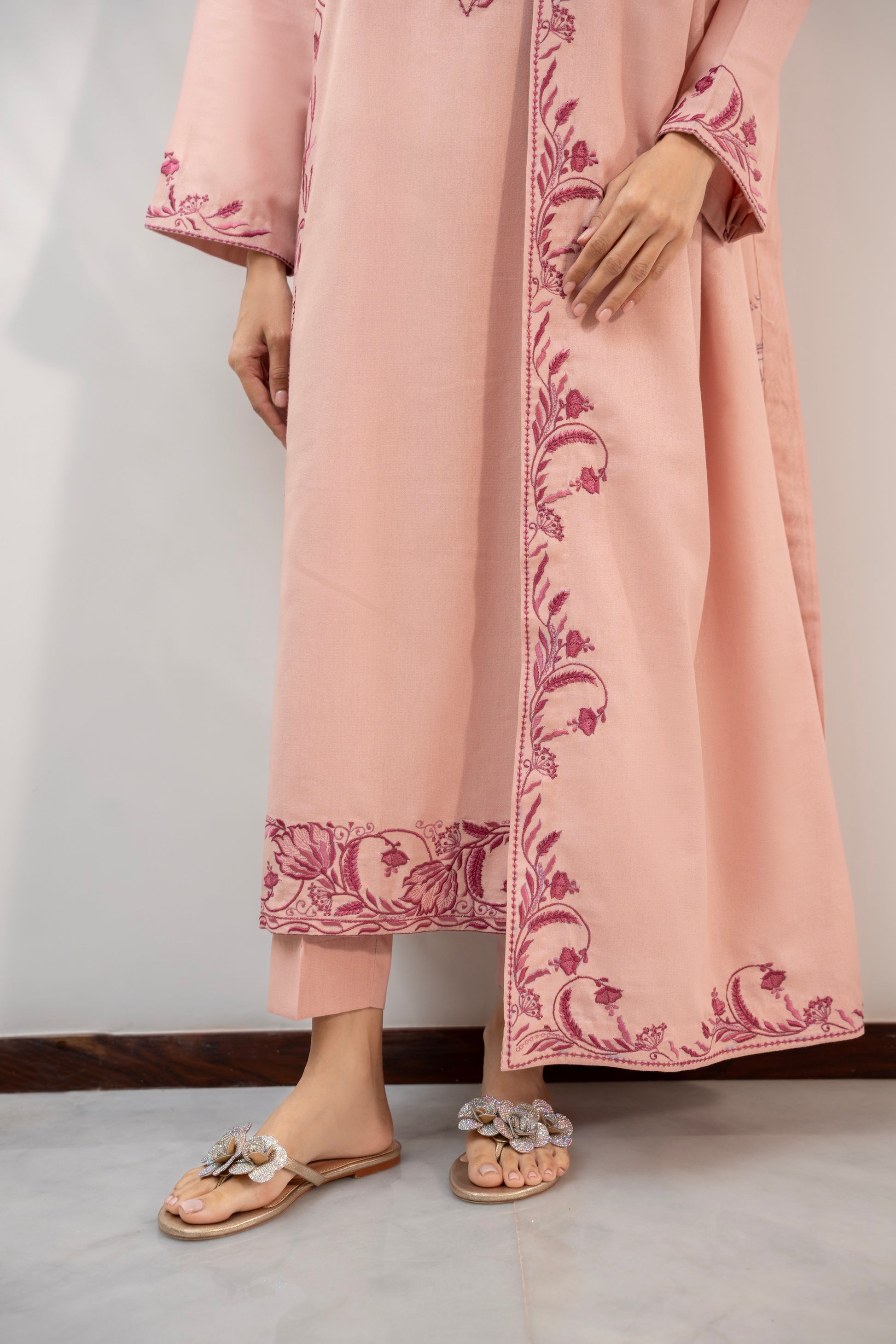 Pastel pink for your evening soirees, this three piece outfit features gorgeous embroidery on the front of the shirt. Paired with a four sided worked shawl - this outfit is a must have.