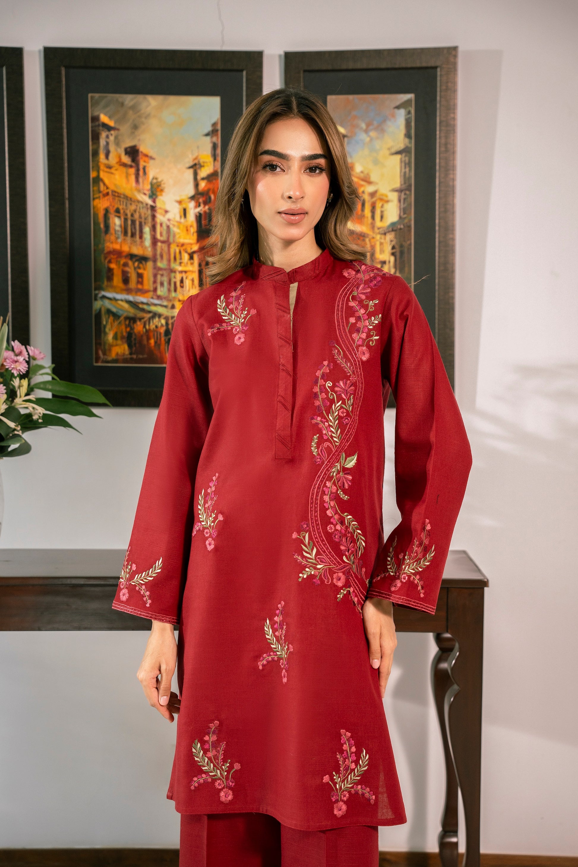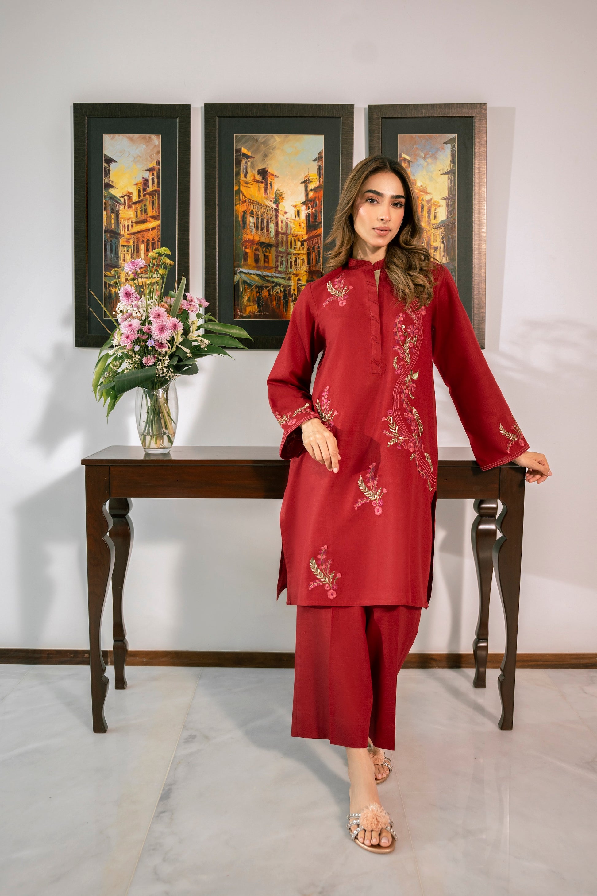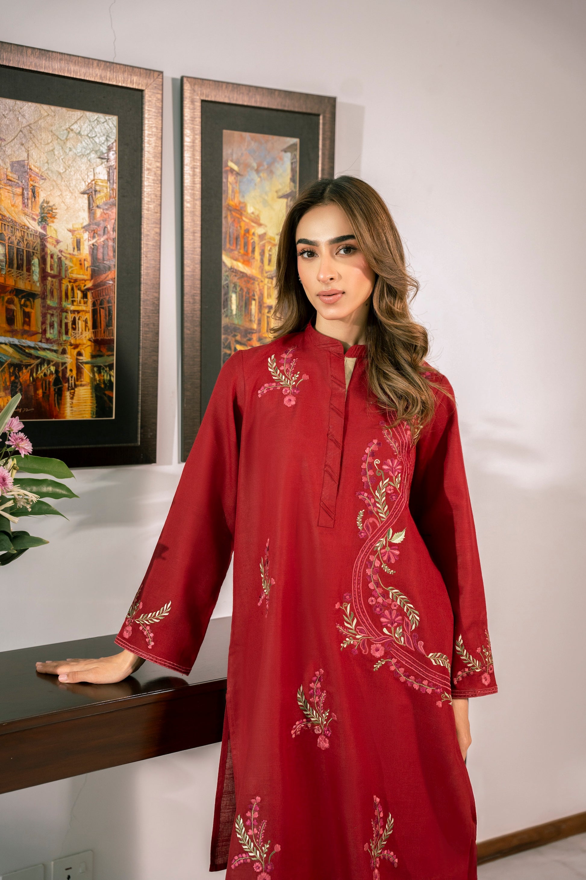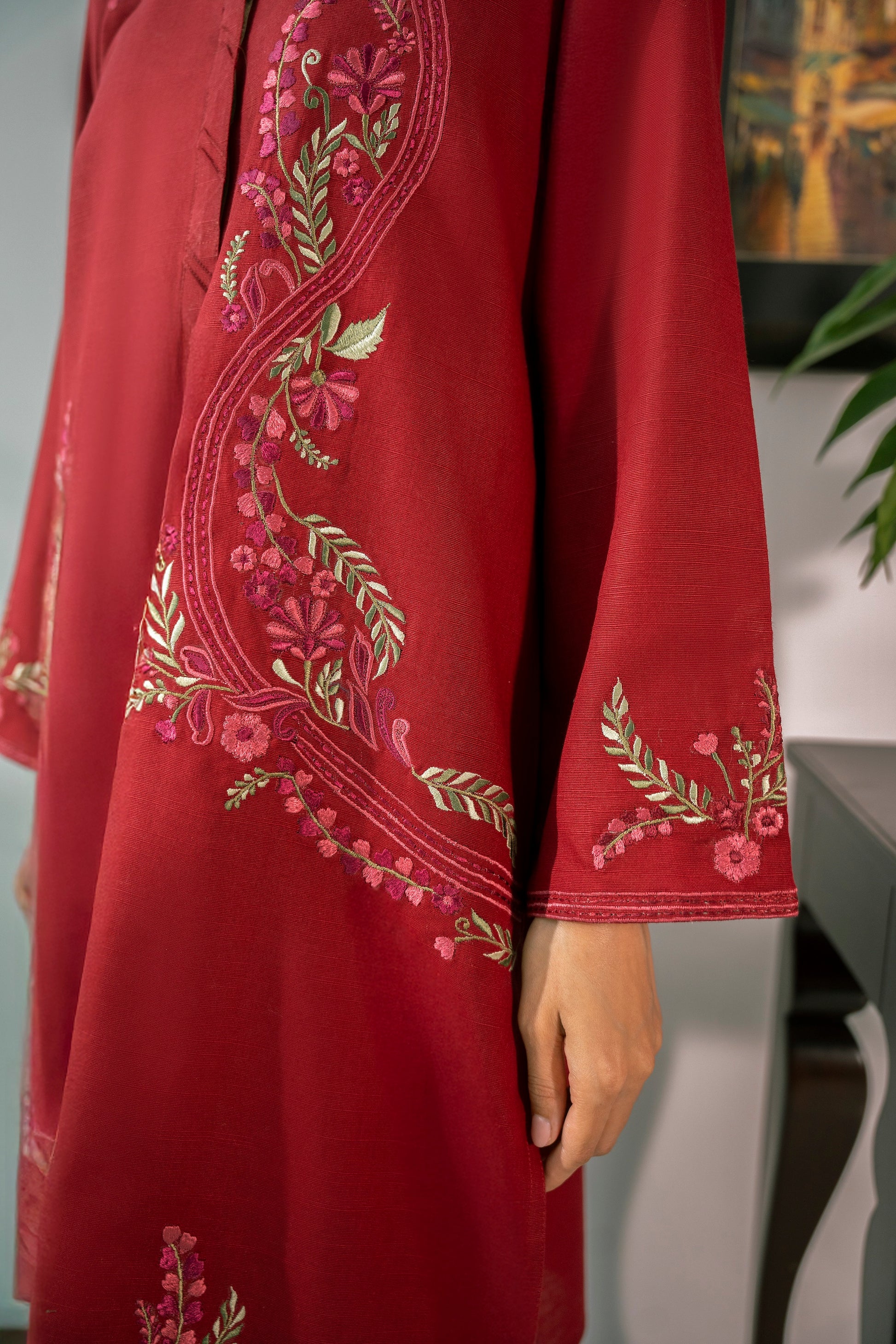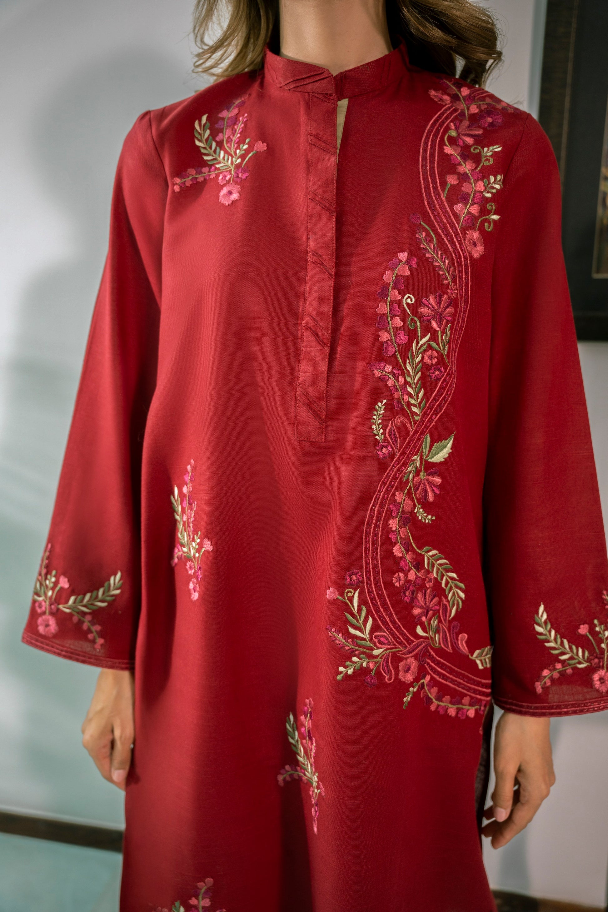 This gorgeous red outfit is enhanced with multicolored embroidery making it perfect for the winter season!