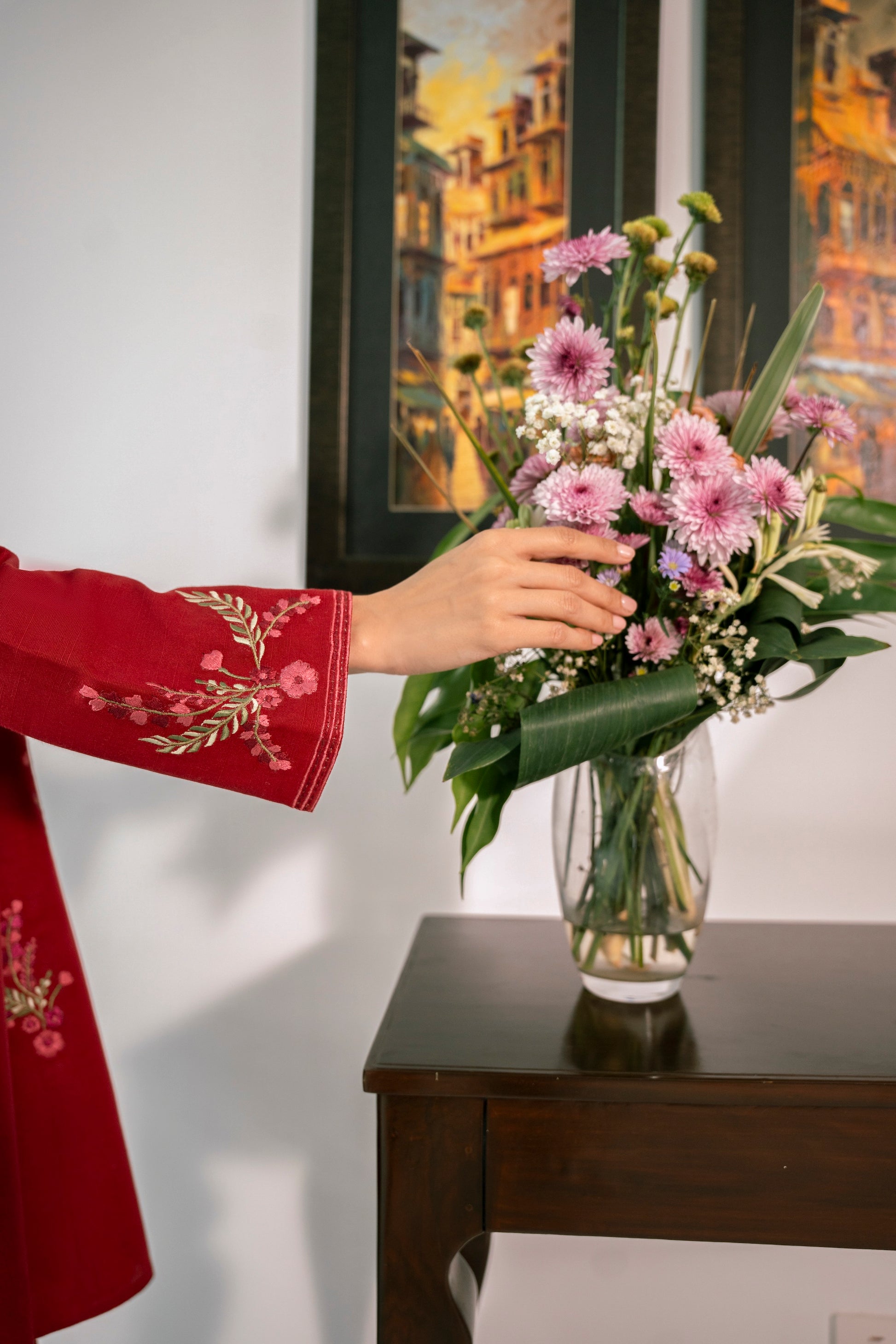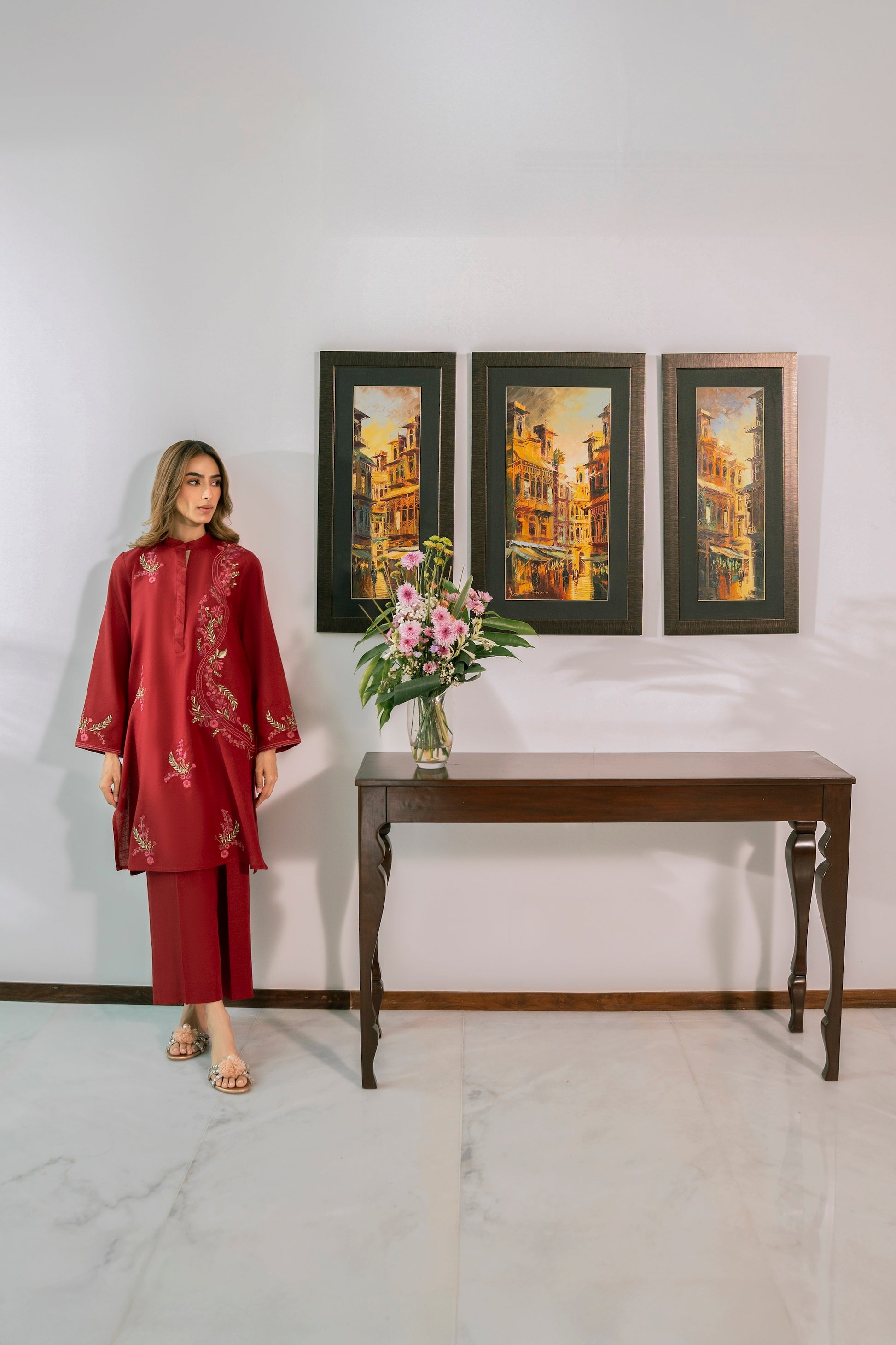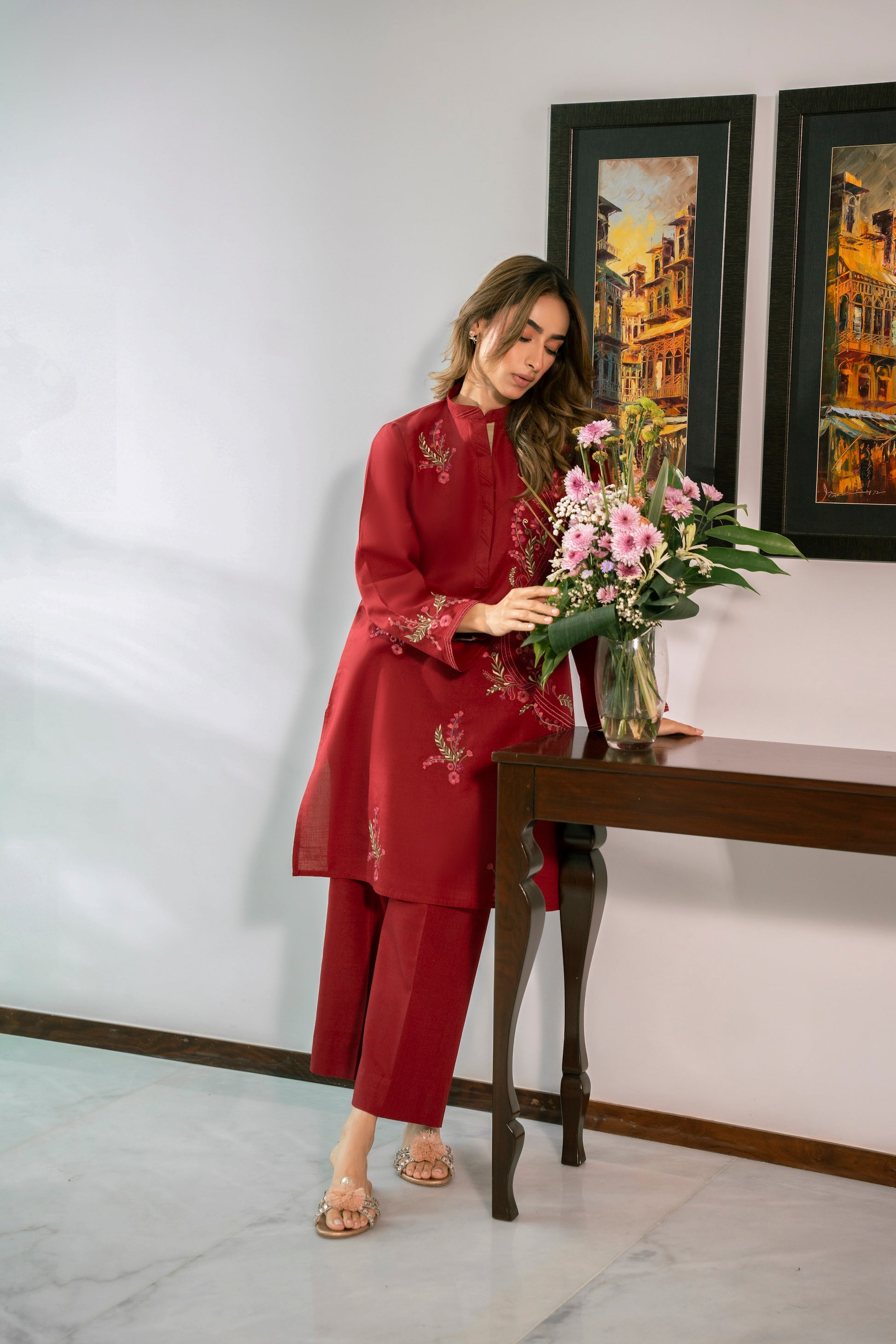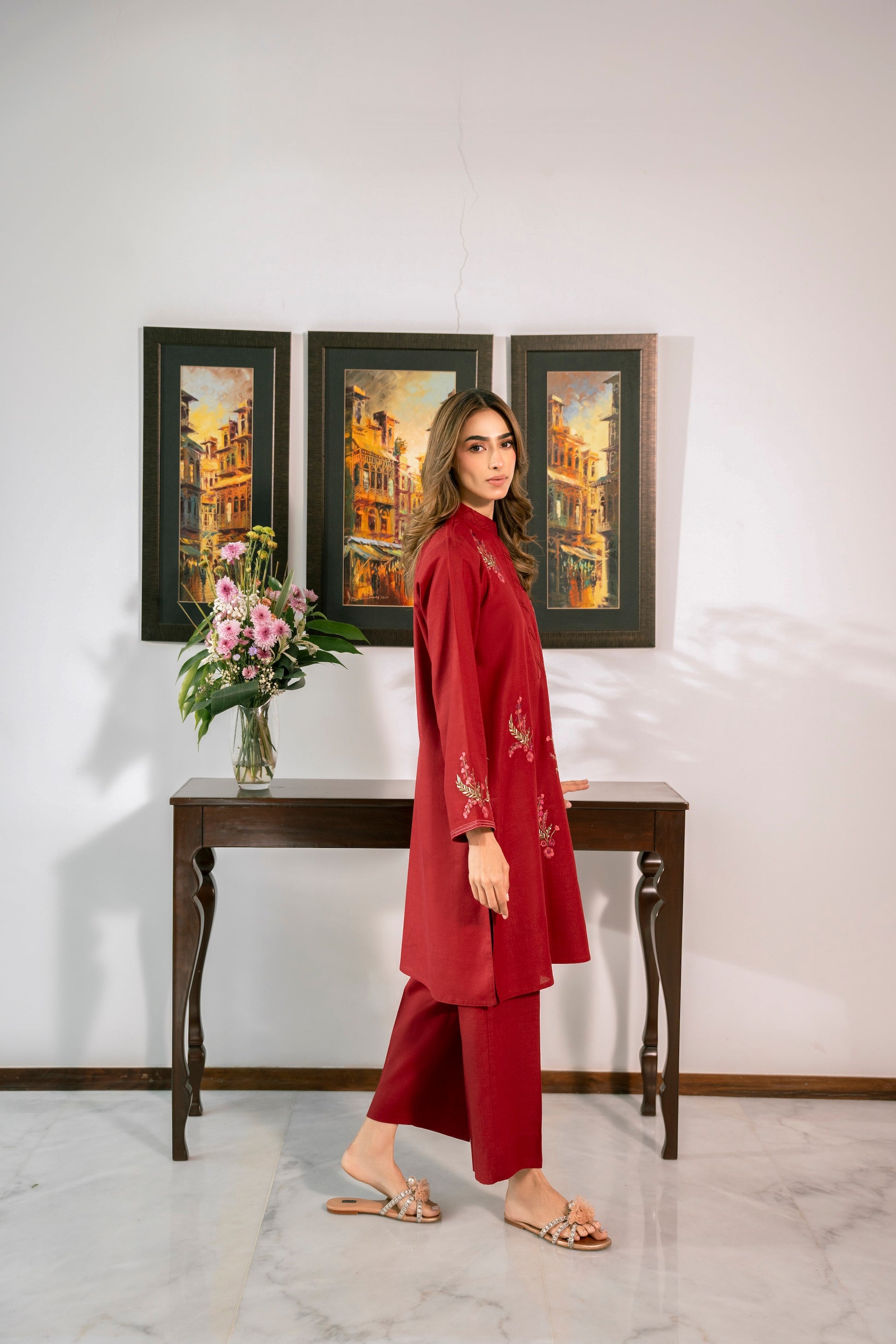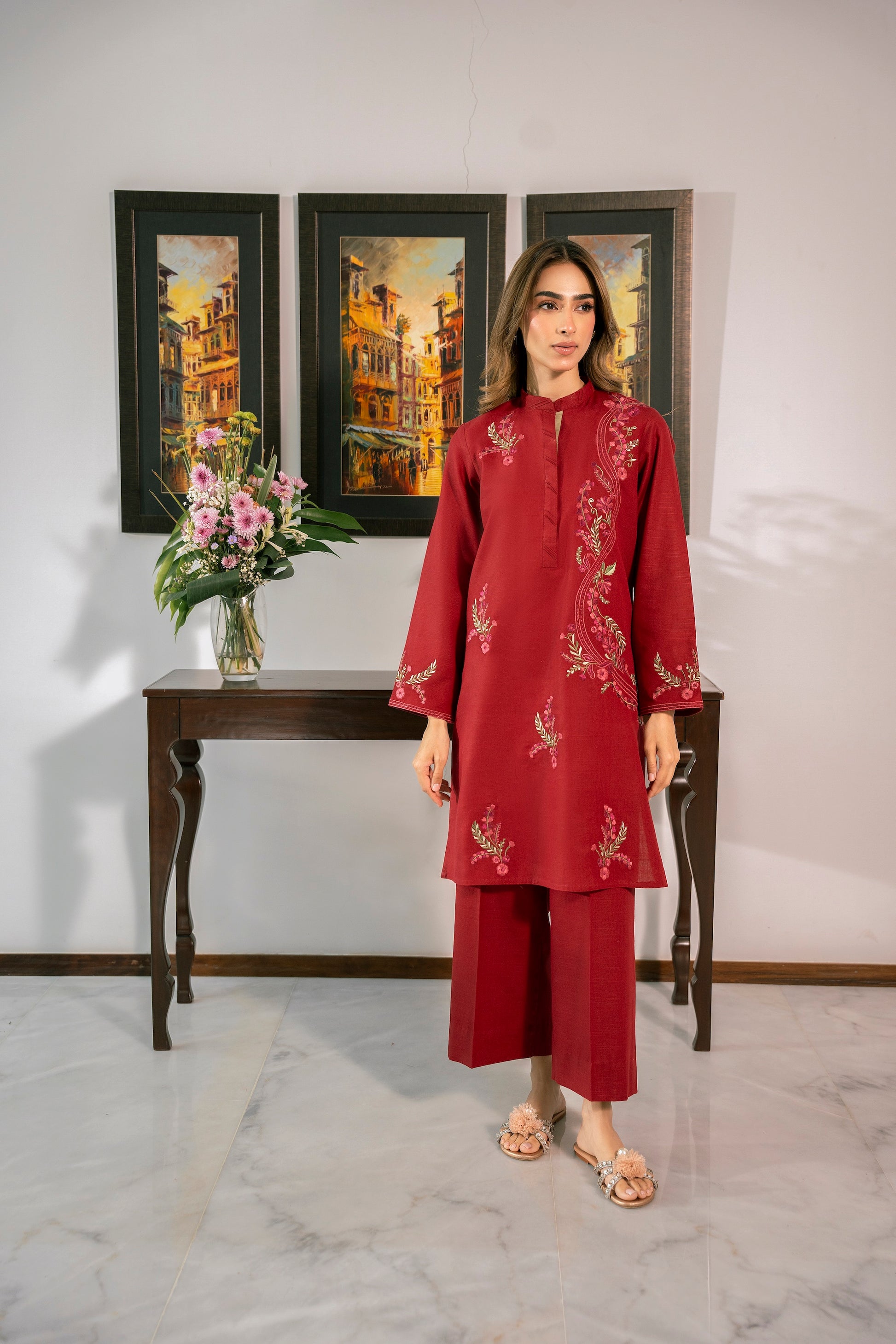 This gorgeous red outfit is enhanced with multicolored embroidery making it perfect for the winter season!
